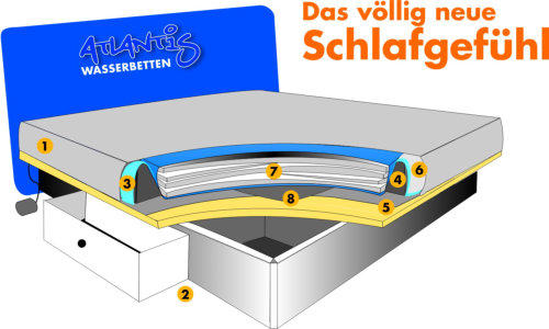 2 Sockel. Trägt das Wasserbett. Besteht aus 4 Gewichtsverteilern und ist auch als Schubkastensockel z.B je Längs-Seite mit 3 Schubladen lieferbar. 3 Sicherheitswanne/Liner. Läuft